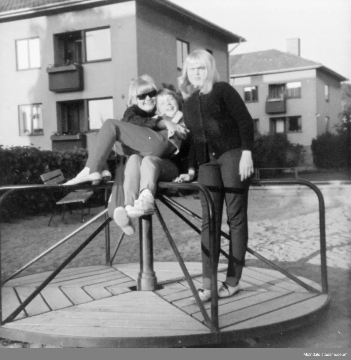 Tre flickor (Eija, Ann-Charlotte och Annette) står på en karusell i en lekpark. Brunnsgatan 4 och 6 syns i bakgrunden. 1960-tal.