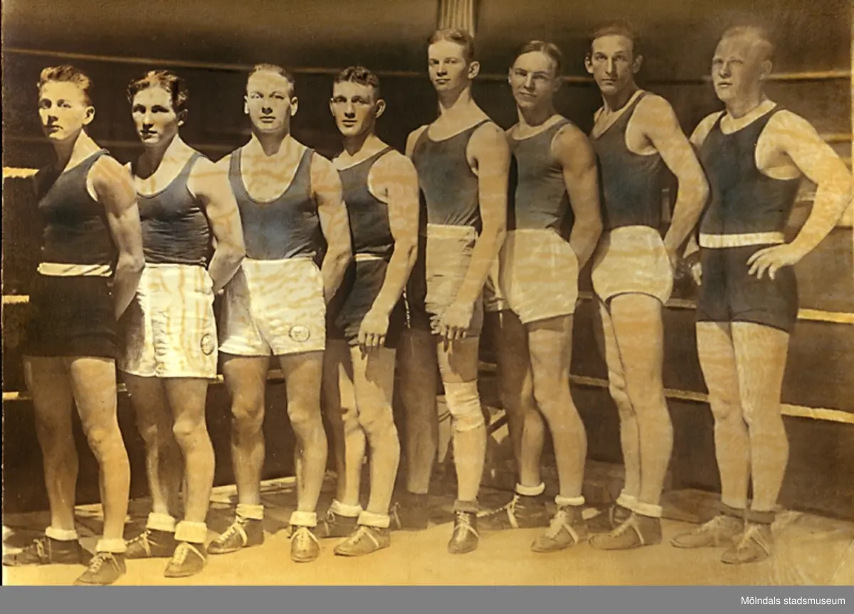 Gruppfoto av mästarna i Västsvenska juniormästerskapen i boxning, 1935. Fr. v: Gunnar Larsson, Mölndal; K. E. Winblad, Halmstad; Olle Larsson, Halmstad; Roland Ahlstrand, Pugilist; K. A. Svensson, Vänersborg; Stig Malmquist, Varberg; Raymund Carlsson, Hisingen; samt Henry Nicklasson, Mölndal (mästare i tungvikt).