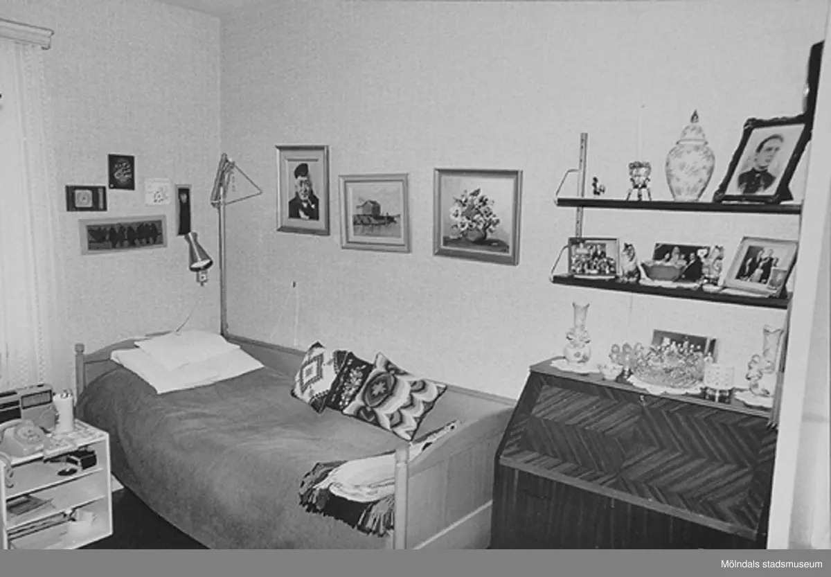Brattåshemmets äldreboende. Ett rum med bl. a. en säng och en byrå med fotografier. Okänt årtal.