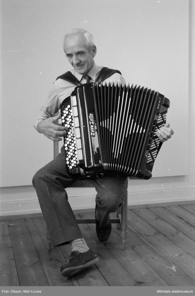 Ivan Svensson, ordförande i Mölndals dragspelsklubb, spelandes dragspel. Mölndals kvarnby 1990.