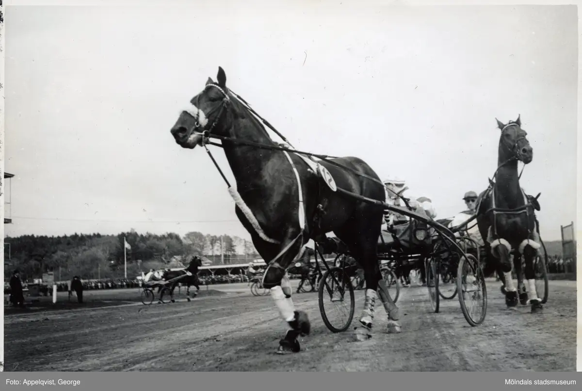 Travhästar på Åby travbana, redo för lopp. Bilden troligen tagen mellan 1947-1952.