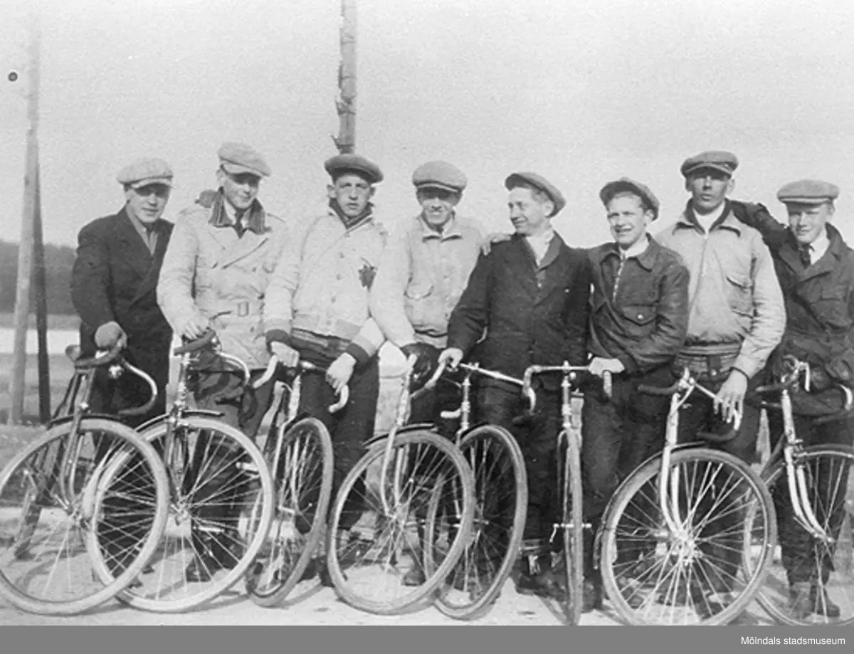 Under bilden står: VÅRTRÄNING. Medlemmar ur MCK är ute och tränar på gränsen mellan Kållered och Mölndal. Från vänster: Lund, Nundstedt, Pettersson, Nygren, Karlsson, Berg, Olsson och Karlsson. Klubben bildades 13/3 1922 (20 medlemmar) och var som bäst 1935-1937.