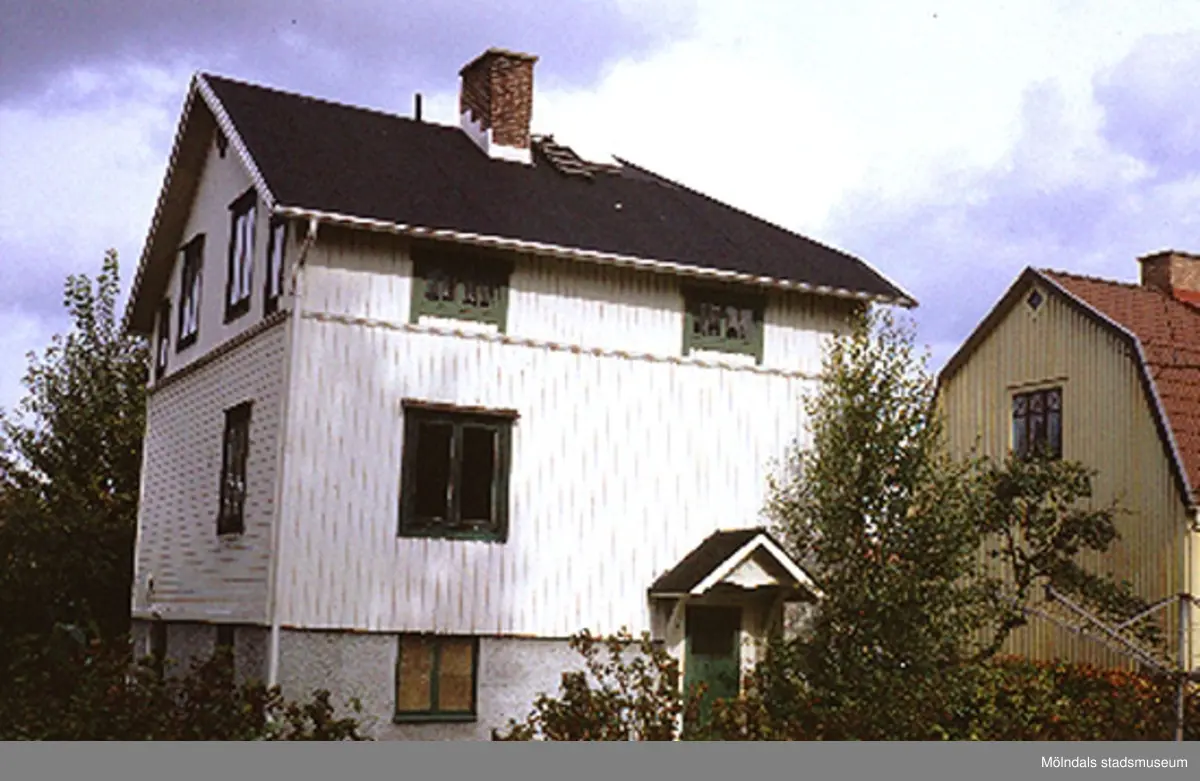 Byggnadsdokumentation av ett bostadshus på Barnhemsgatan 17, Nejonögat 12, Broslätt 1990. Det finns en torkvinda i trädgården. Relaterat motiv: 2004_1255.