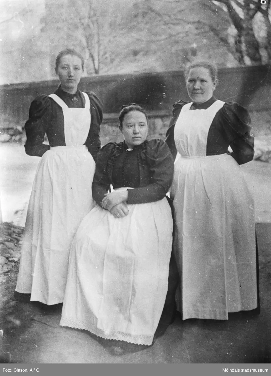 Sköterskorna Anna Ahlberg, Hanna Johansson samt kokerskan Mari Johansson utanför Mölndals sjukstuga år 1895.