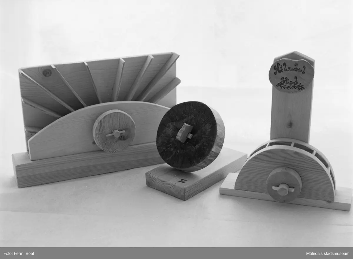 Tre olika träarbeten (brevpress, pennställ) med kvarnhjul som igenkänningstecken. Inlämnat förslag till en tävling 1992 om souvenir för Mölndal.