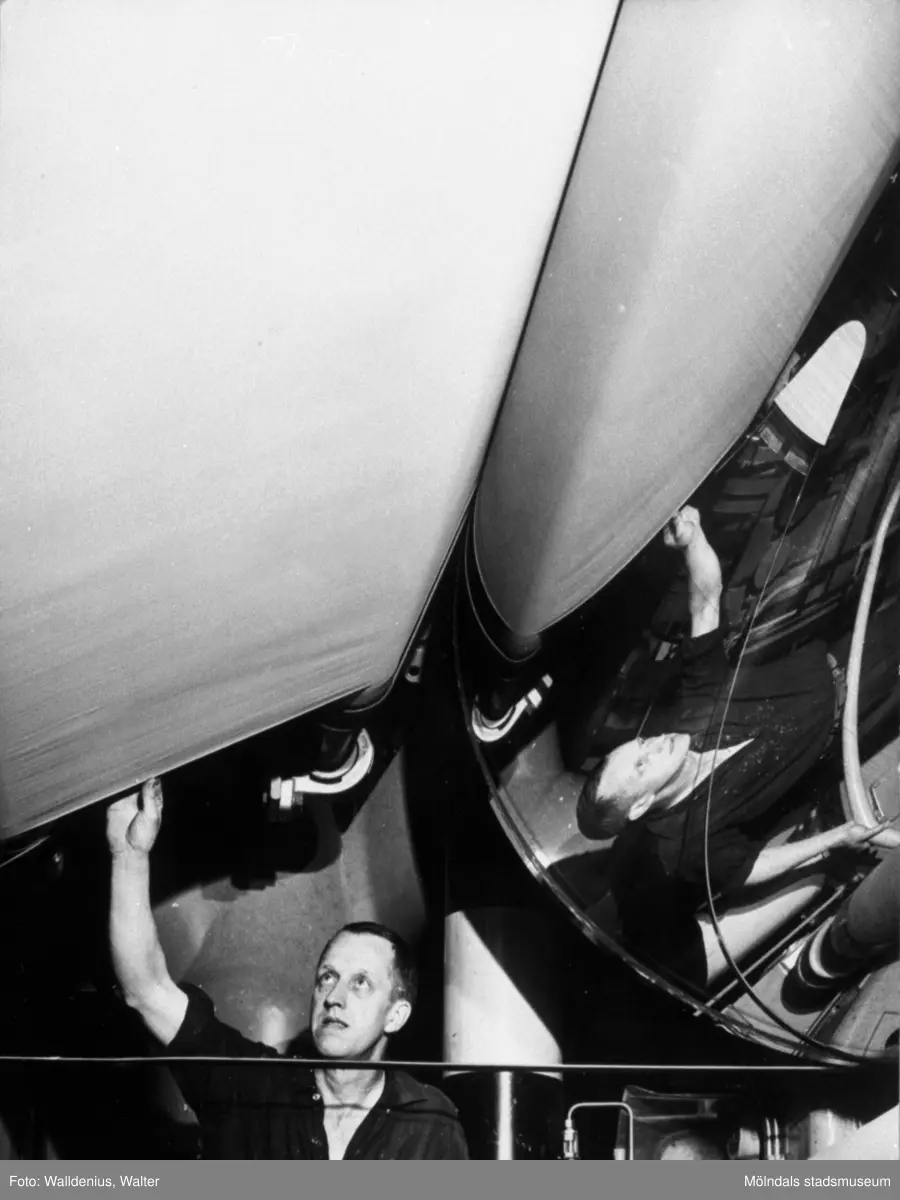5:ans pappersmaskin invigs på Papyrus i Mölndal år 1965. Blankcylinder. Kurt Floman vid maskinen.