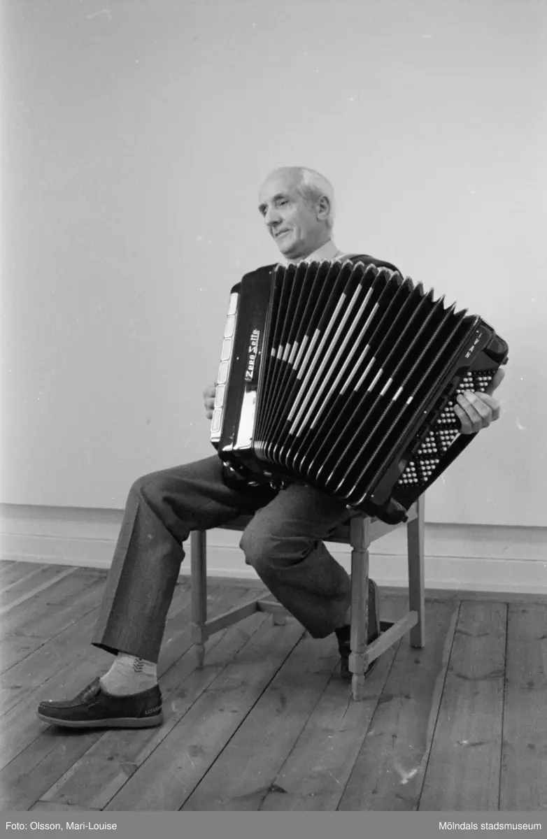 Ivan Svensson, ordförande i Mölndals dragspelsklubb, spelandes dragspel. Mölndals kvarnby 1990.