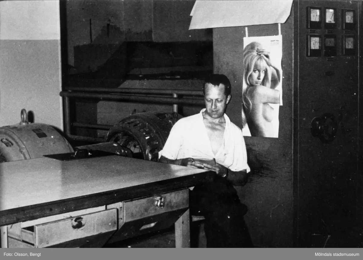 Maskinförare Kurt Floman läser vid förarbordet PM 10 på Papyrus i Mölndal år 1962. Till höger manöverskåpet. Affisch med kvinna på väggen.