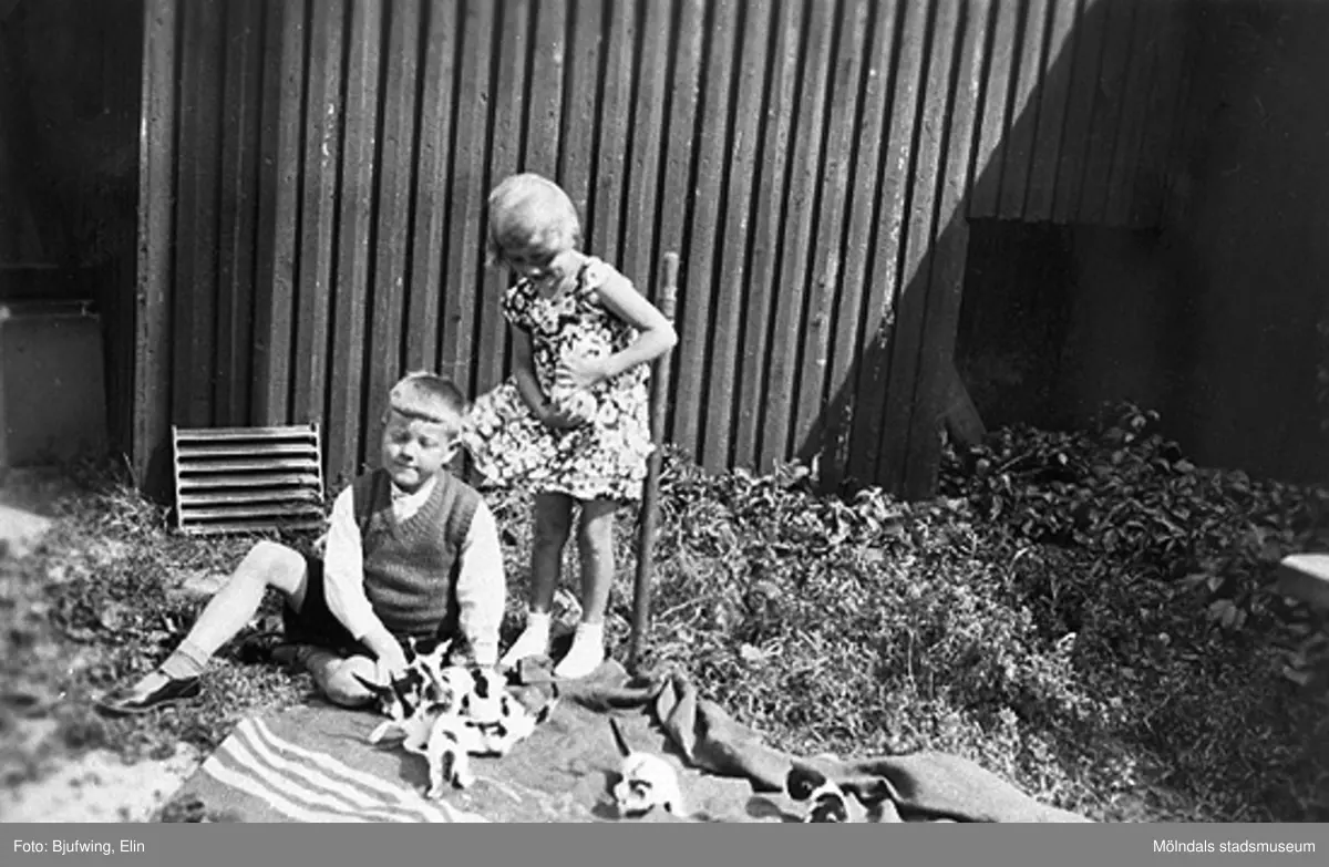 Kusinerna Ingemar Larsson och Lillemor Andersson leker med kattungar utanför kvarnen på Göteborgsvägen. Lillemors far var innehavare till kvarnen.
