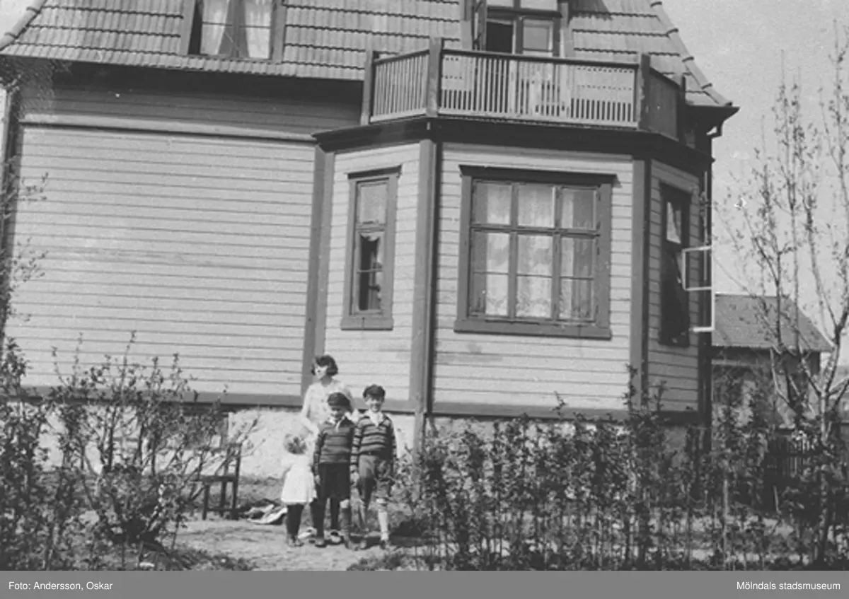 Elisabet Stam Andersson med sina barn Lillemor och Lasse med kompisen Arne, stående framför huset på Barnhemsgatan 13.