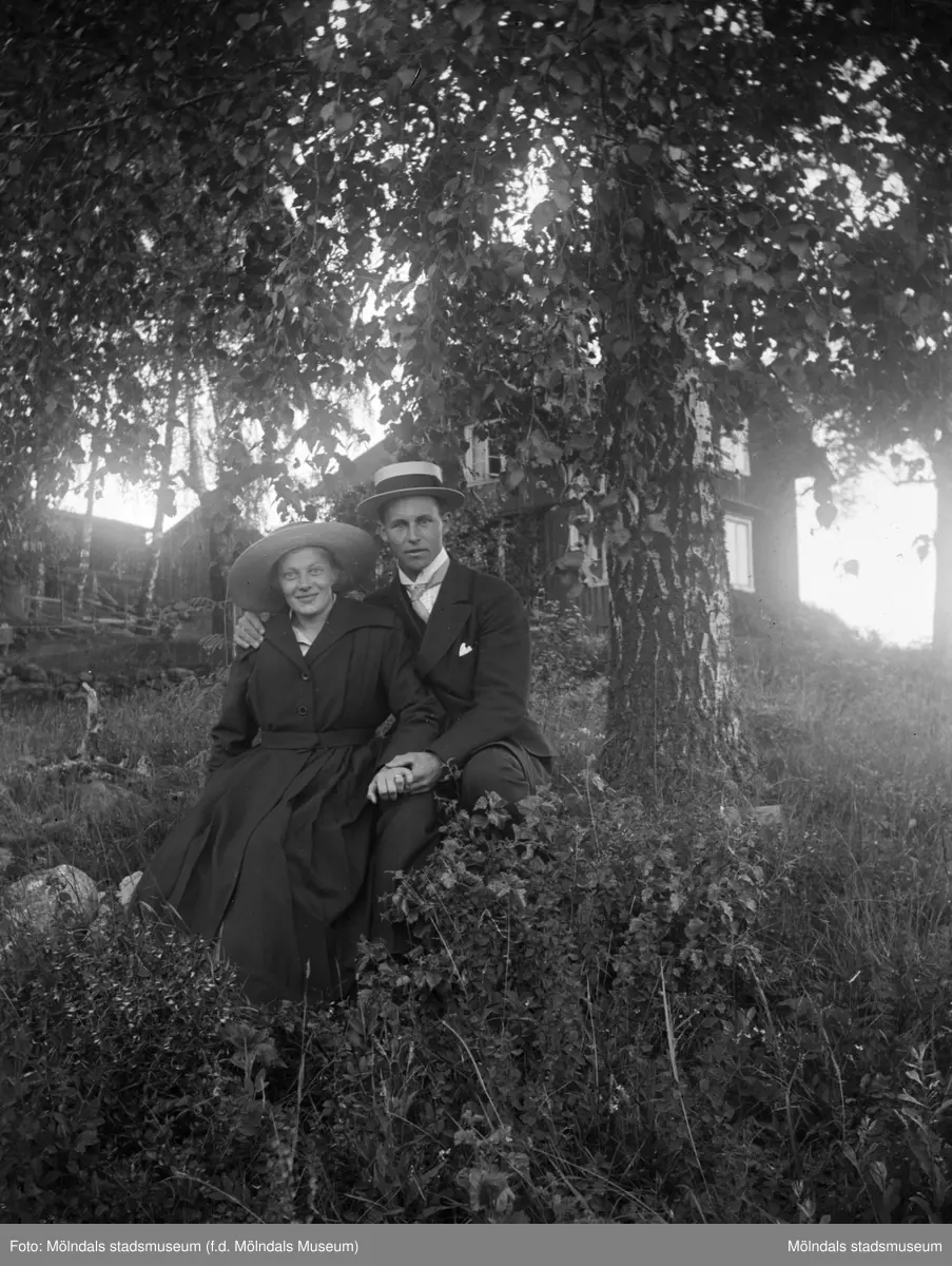 Ett ungt kärlekspar som sitter vid ett träd. Mannen håller om kvinnan. Båda är snyggt klädda och bär hatt. Kanske är det en förlovningsdag. I omgivningen ser man träd, buskar och byggnader. Troligtvis 1920-30-tal.