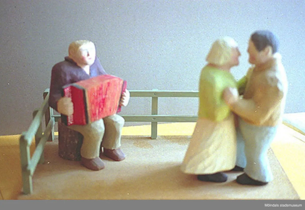 Ett par dansar med varandra på en dansbana. I ena hörnet sitter en gubbe och spelar dragspel. Harry Bergmans "gubbar" (träfigurer).
