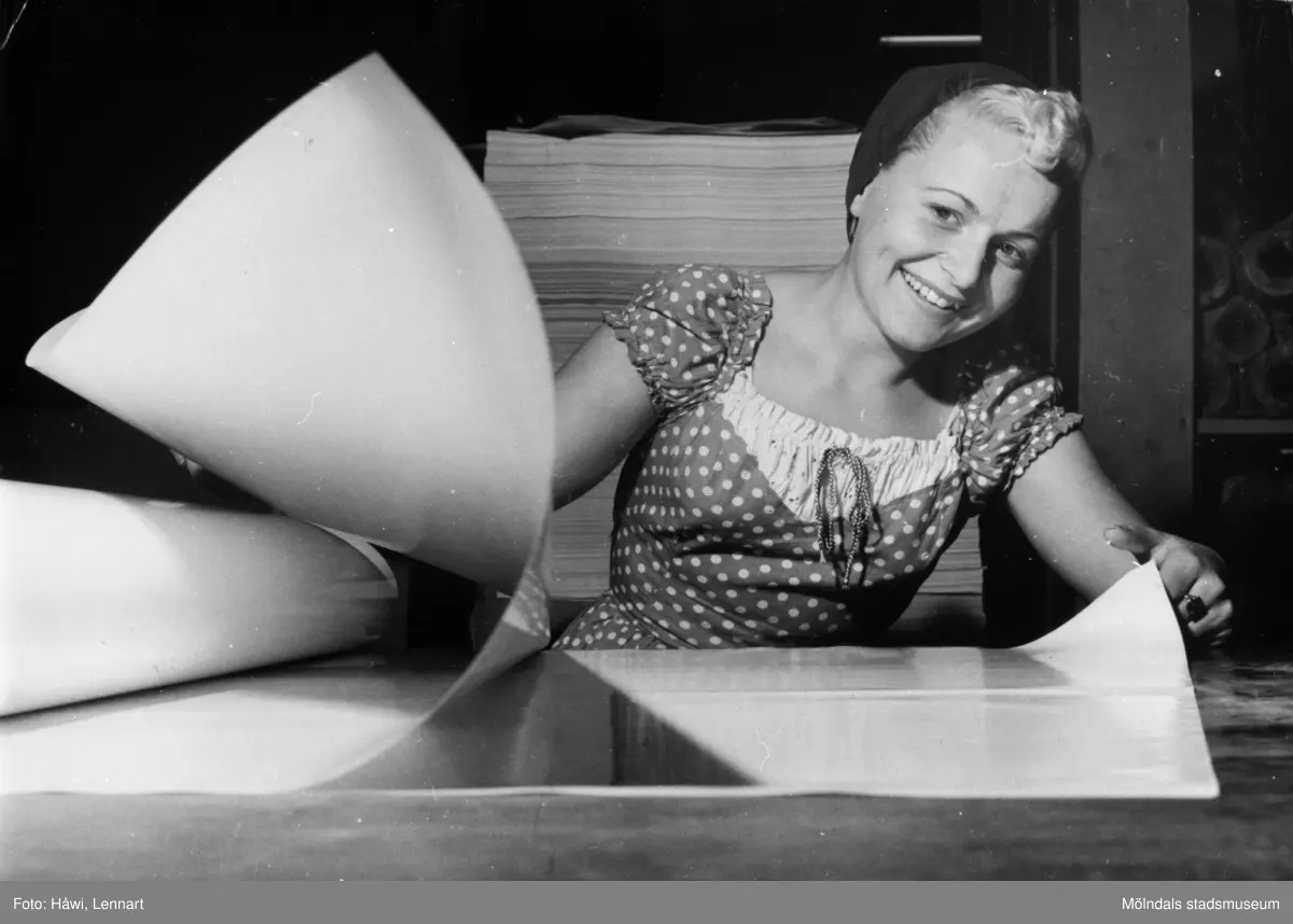 Porträtt av en kvinna som sorterar papper på Papyrus i Mölndal på 1950-talet.
