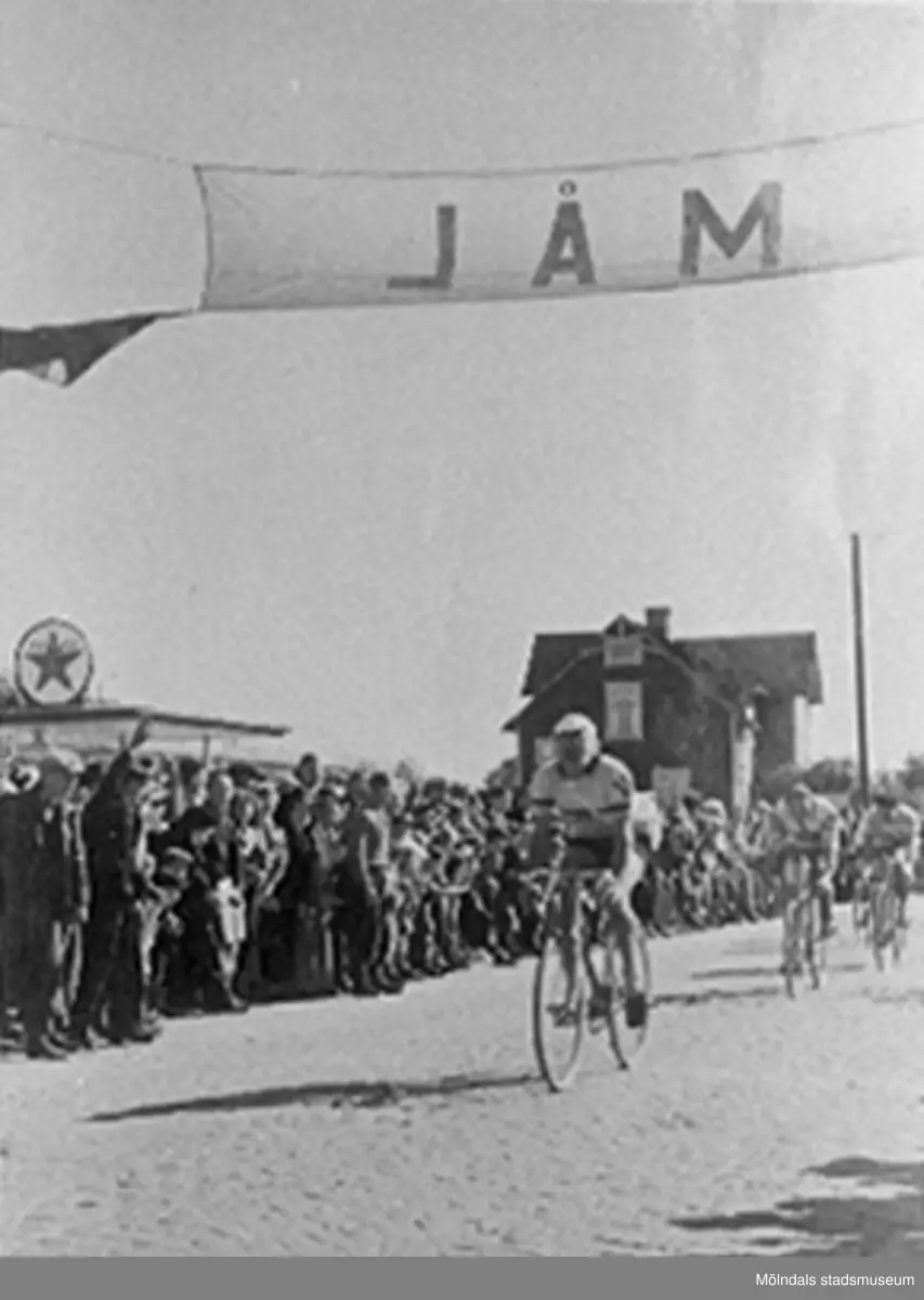 Fotografens namn står som regel inte utsatt, men fotograf är oftast Kalle själv, ibland någon tidningsfotograf och ibland någon klubbkamrat. Ovanför bilden står: TRIANGELLOPPET. Under bilden står: ANDERS PERSSON. Den är tagen från målet (samma plats som starten) i Triangelloppet 1935 eller 1936. Starten gick från nuvarande Gamla Kungsbackavägen, utanför dåvarande Brandahls (där damväskor tillverkades).