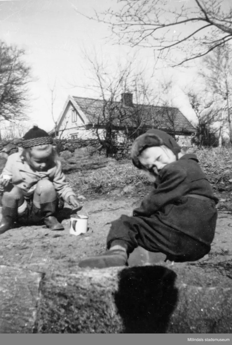 Marie-Louise Lindholm (gift Carlsson) och Lisbeth leker med spade och mugg i trädgården. Flickorna leker på Görjekullen (längst upp på nuvarande Åldermansgatan). I bakgrunden ses Roten K 18, 1950-tal.