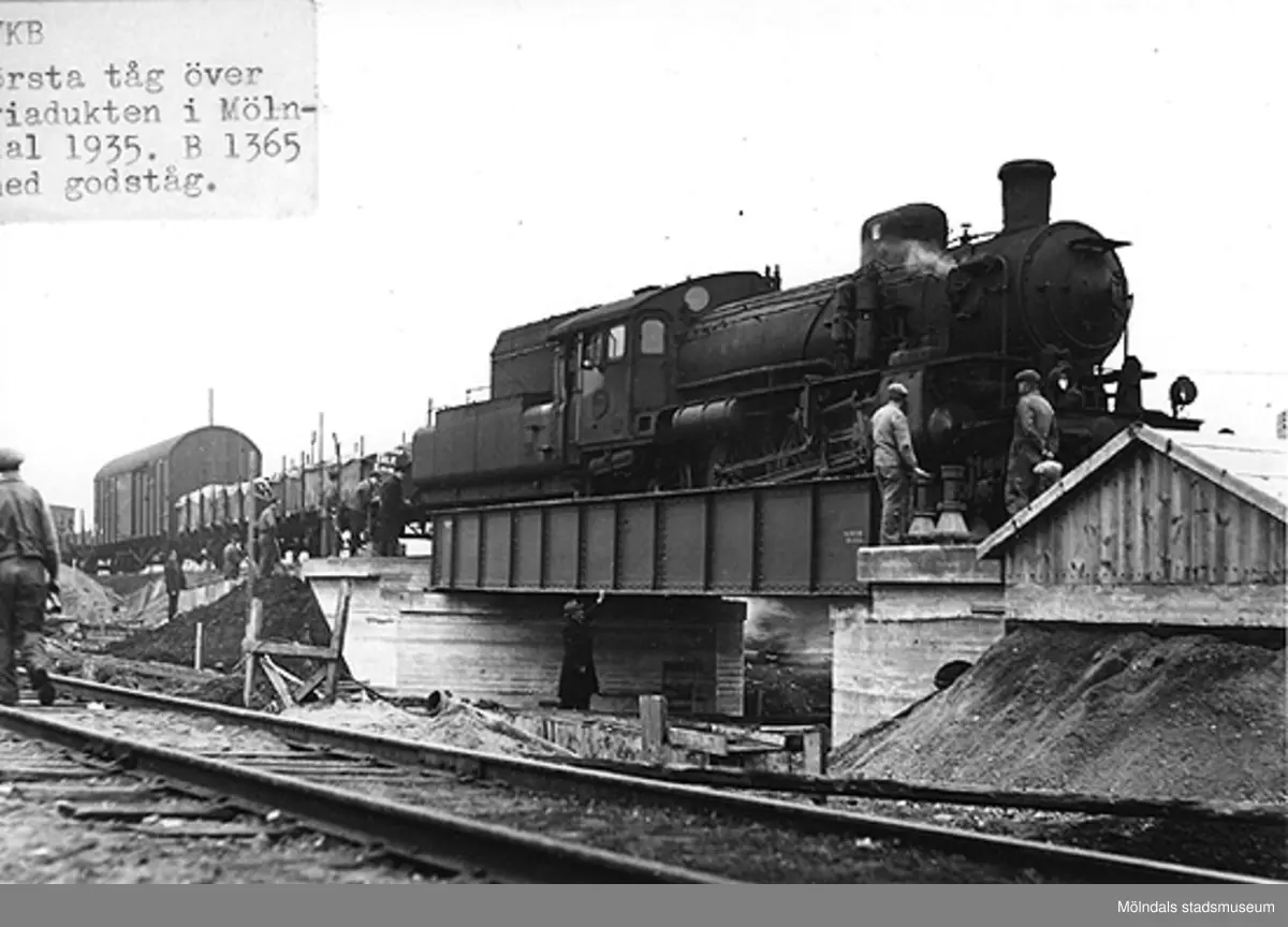 Första tåget över viadukten vid Åbro i Mölndal år 1935.