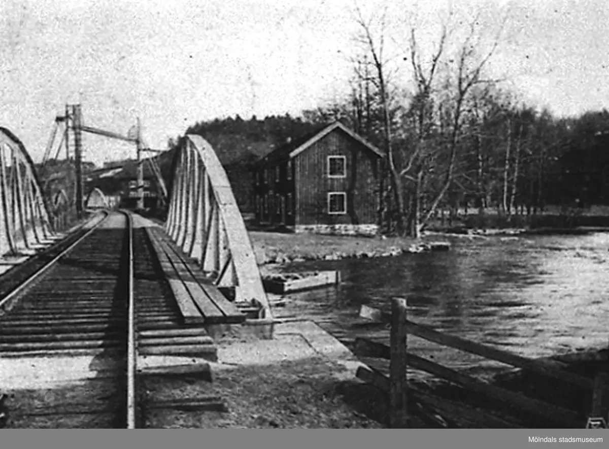 Bro öfver Mölndalsån, okänt årtal. Järnvägsbron öster om Carlsfors fabriker (Kvarnfallet 31) och öster om Grevedämmets skola.