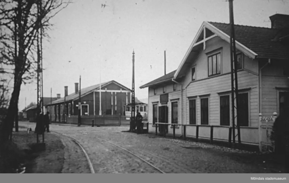 Vy över Mölndalsbro, 1920-tal. Till vänster ses de två spårvagnshallarna (i hörnet mellan Göteborgsvägen och Kvarnbygatan). Till höger ligger Kungsbackavägen 1 (Hjertstrands eller bankhuset). Samma foto som: 1995_0793.