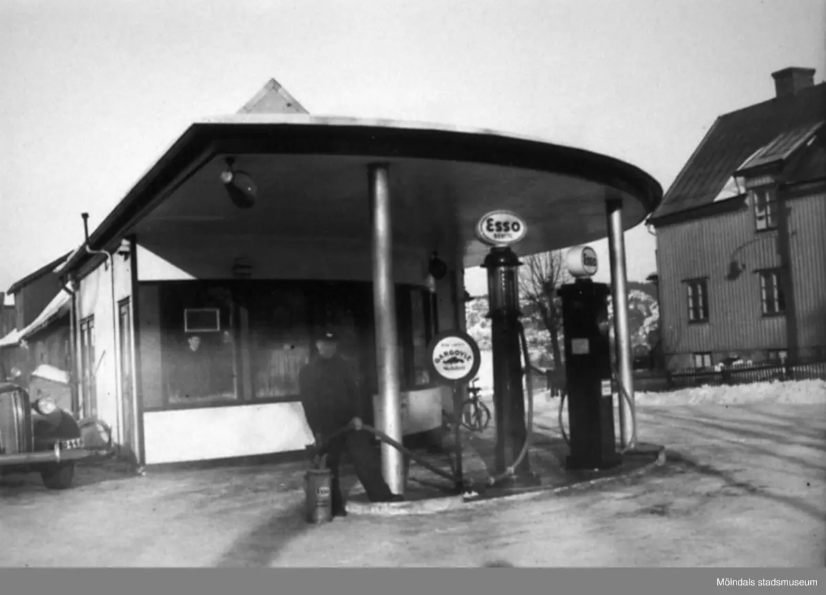 Gunnar Olssons bensinstation (Esso-tappen) i vinkeln mellan Frölundagatan och Toltorpsgatan år 1946. Samma foto som: 1995_0837.