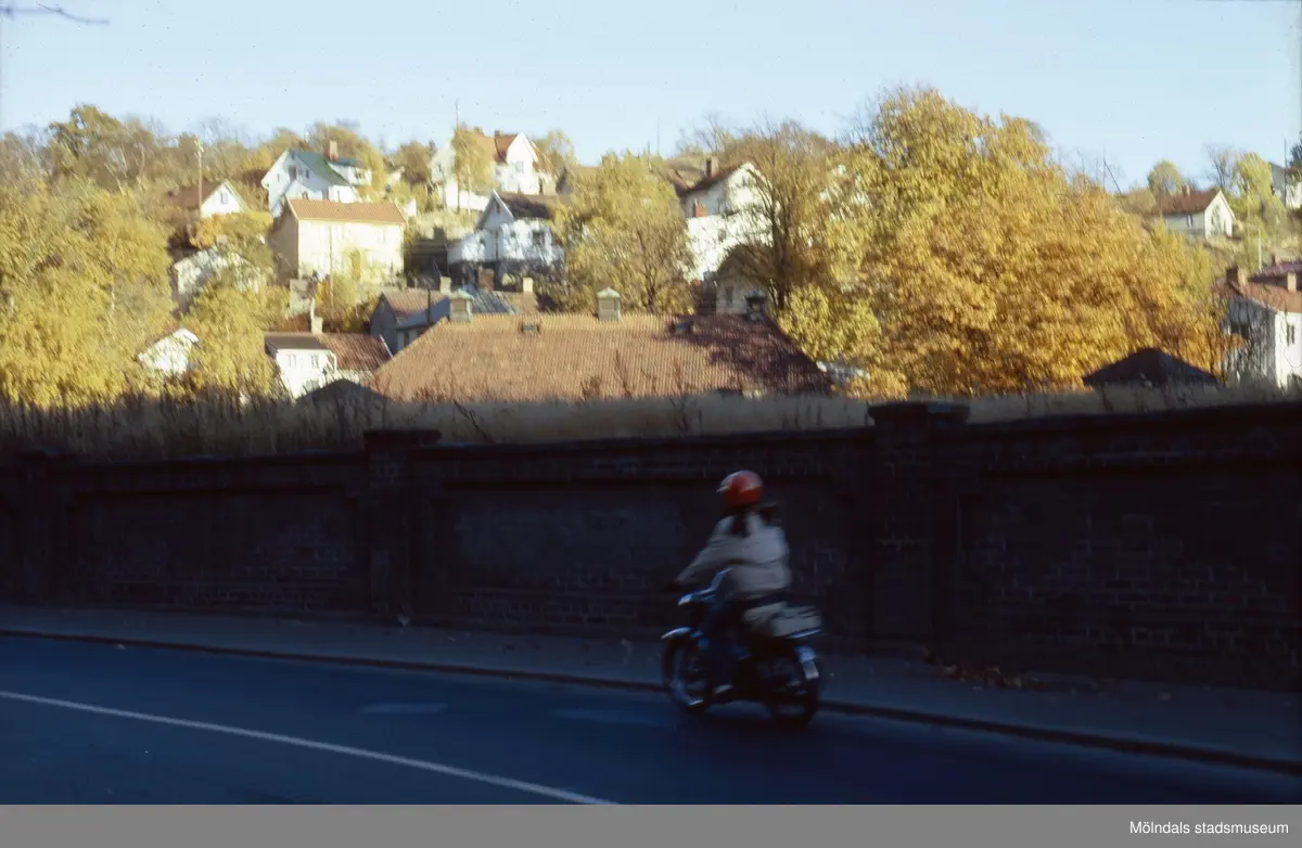 Bebyggelse vid Roten M i Mölndals Kvarnby på 1970-talet. Vy över pappersbruket Papyrus mur.