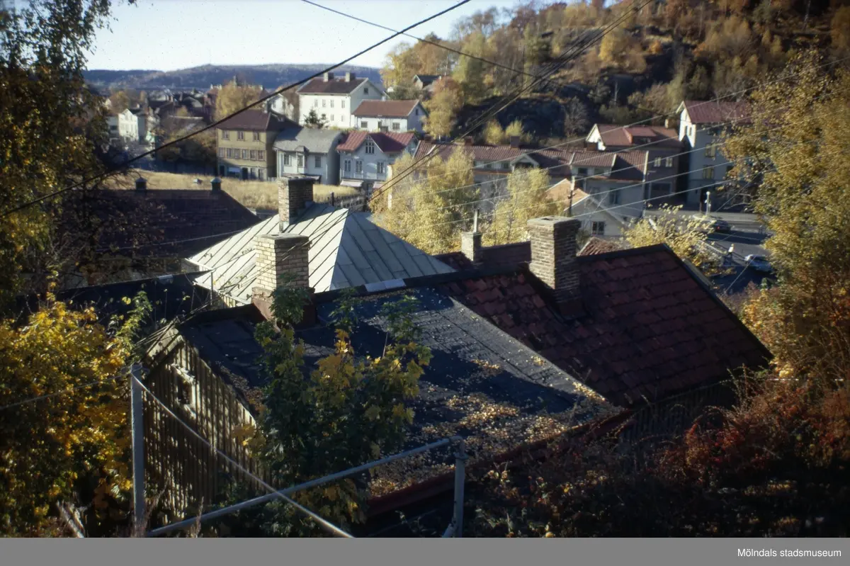 Huset närmast är Roten M 16 i Mölndals Kvarnby på 1970-talet. I bakgrunden ses byggnader längs Kvarnbygatan.