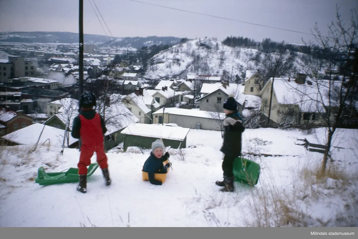 Barn som åker pulka. Utsikt över Roten L i Mölndals Kvarnby, 1970-tal.