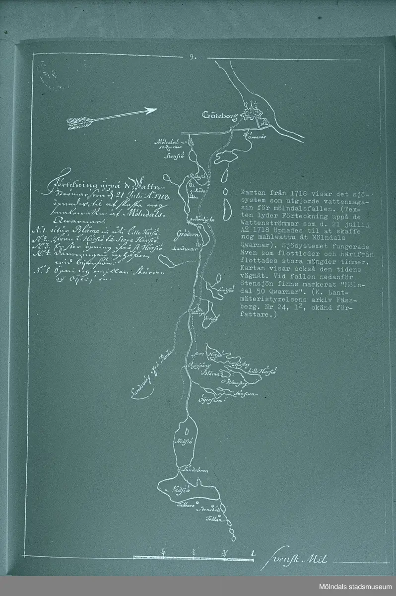 Kartan från 1718 visar det sjösystem som utgjorde vattenmagasin för Mölndalsfallen. Illustration i Helena Jakobssons bok om Mölndals Kvarnby från 1972.