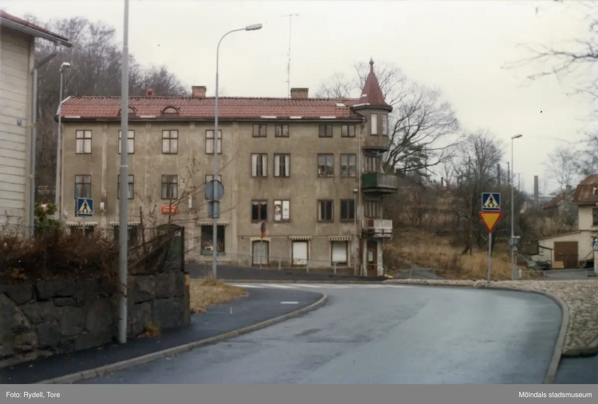 Vy från gamla Kvarnbygatan mot huset Trädgårdsgatan 4 i Trädgården, Mölndal, på 1970-talet.
