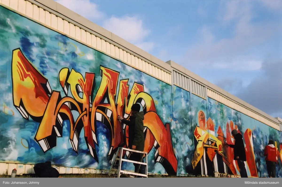 Titel: Graffiti längs Kvarnbygatan i Mölndal, år 2003.