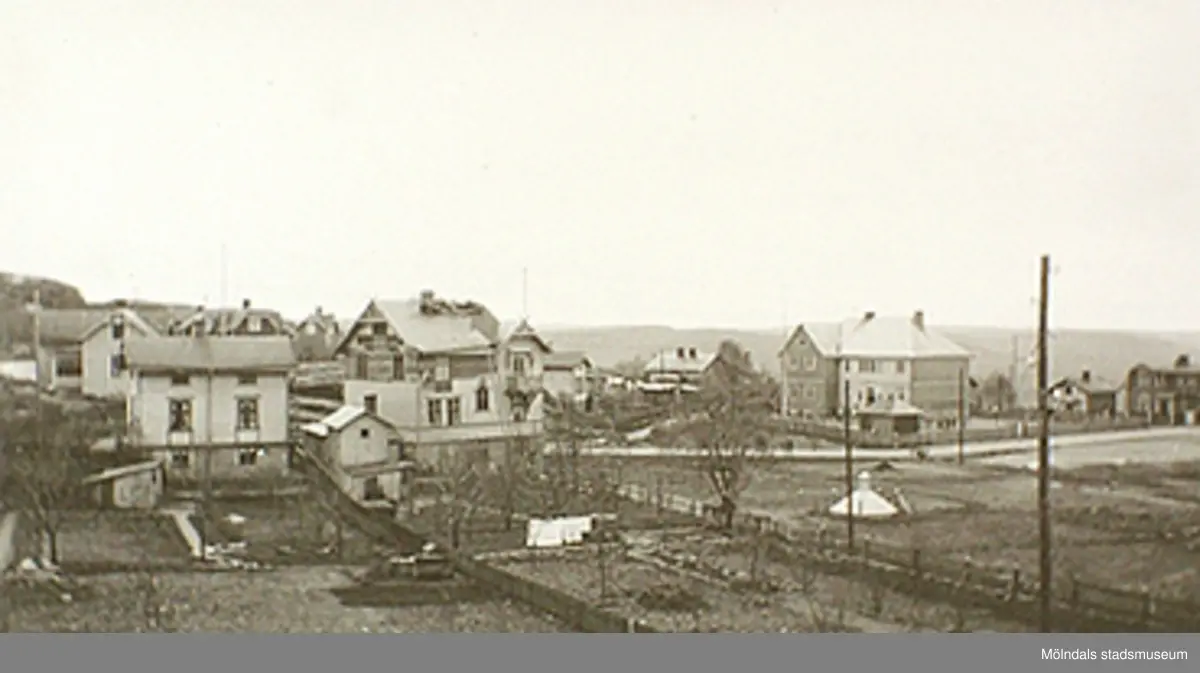 Till vänster: Wallerstedts hus på Rygatan 19. Huset med byggnadsarbete var Rygatan 17 som då var riksdagsman Theodor Nilssons "Theddeus" hus. Till höger: Ryets skola. I förgrunden ses en källa där man hämtade vatten (på bilden överbyggd med runt tak). Okänt årtal.