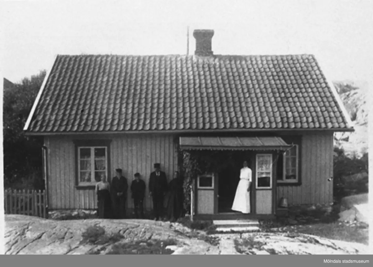 Boningshuset där familjen Westerberg bor på Dyngö (Fjällbacka), 1910-tal. Femte person från vänster är Hilma Westerberg (mormors mor till givaren).
