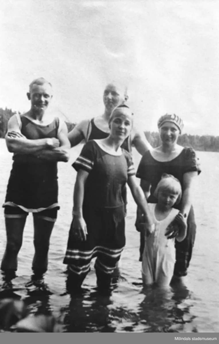 Titel:Badklädda personer står i Tulebosjön, 1920-tal.