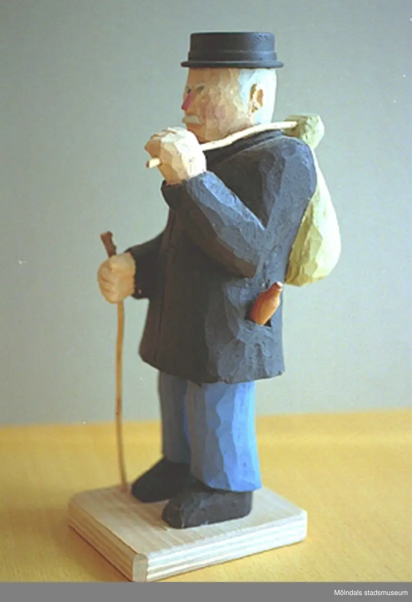 En hattförsedd man som har en påse på ryggen. Han håller en käpp i ena handen. I fickan skymtar man en ölflaska. Harry Bergmans "gubbar" (träfigurer).