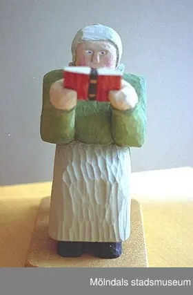 En gråhårig gumma sitter ner och läser i en bibel. Harry Bergmans "gubbar" (träfigurer).