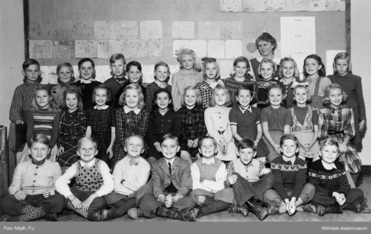 Flickor och pojkar sittande och stående i klassrum på Kvarnbyskolan i Mölndal år 1949. Teckningar på väggen bakom. Med på fotot är givaren Margit Hellström (f. Willumsen).