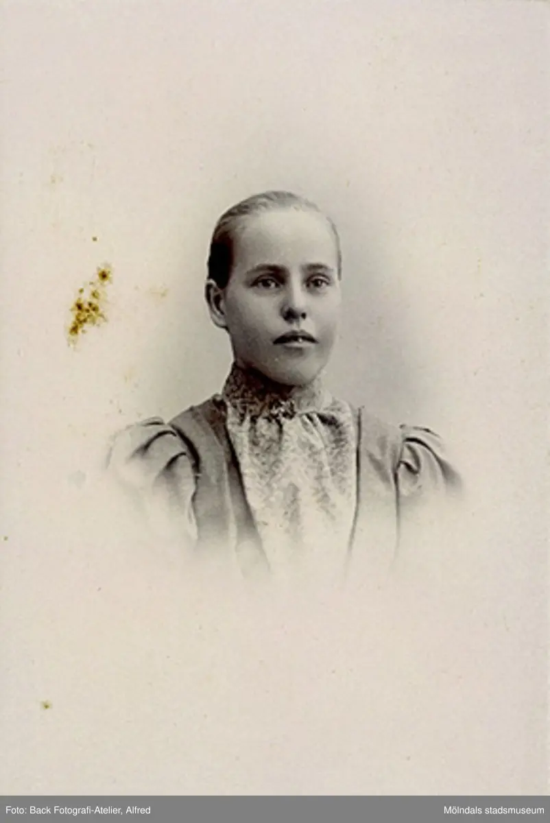 Bystporträtt av en ung kvinna, taget omkring 1895-1905 av en ateljéfotograf. Fotografiet är ett s k visitkort. Dessa blev mycket populära och vanliga från och med 1860-talet, då ny teknik gjort det möjligt att framställa många kopior