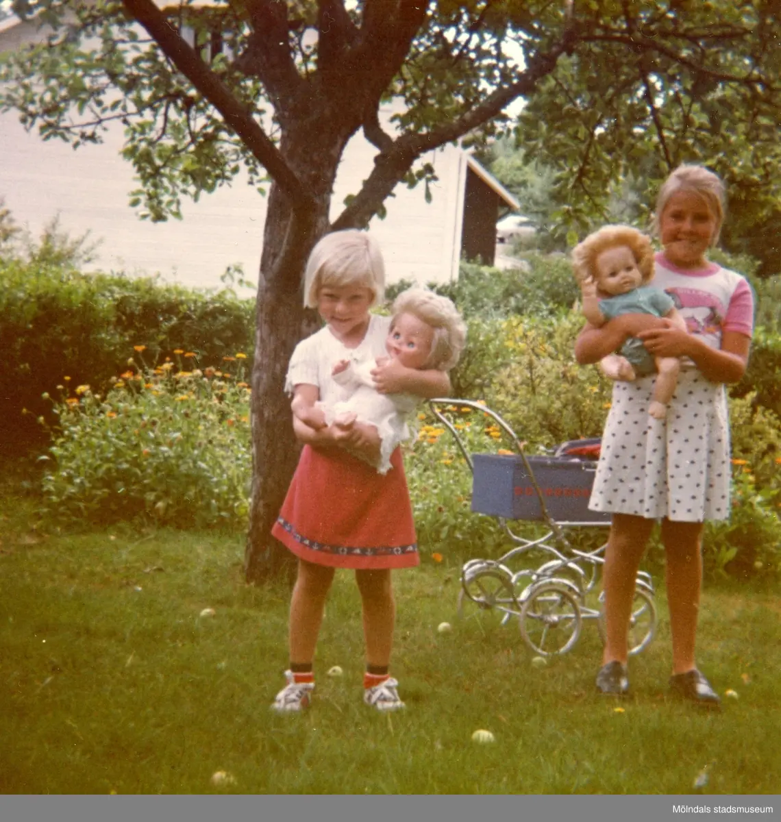 Christine med sin syster Ingela i mormor och morfars trädgård på Kryssgatan i Mölndal, augusti 1976.