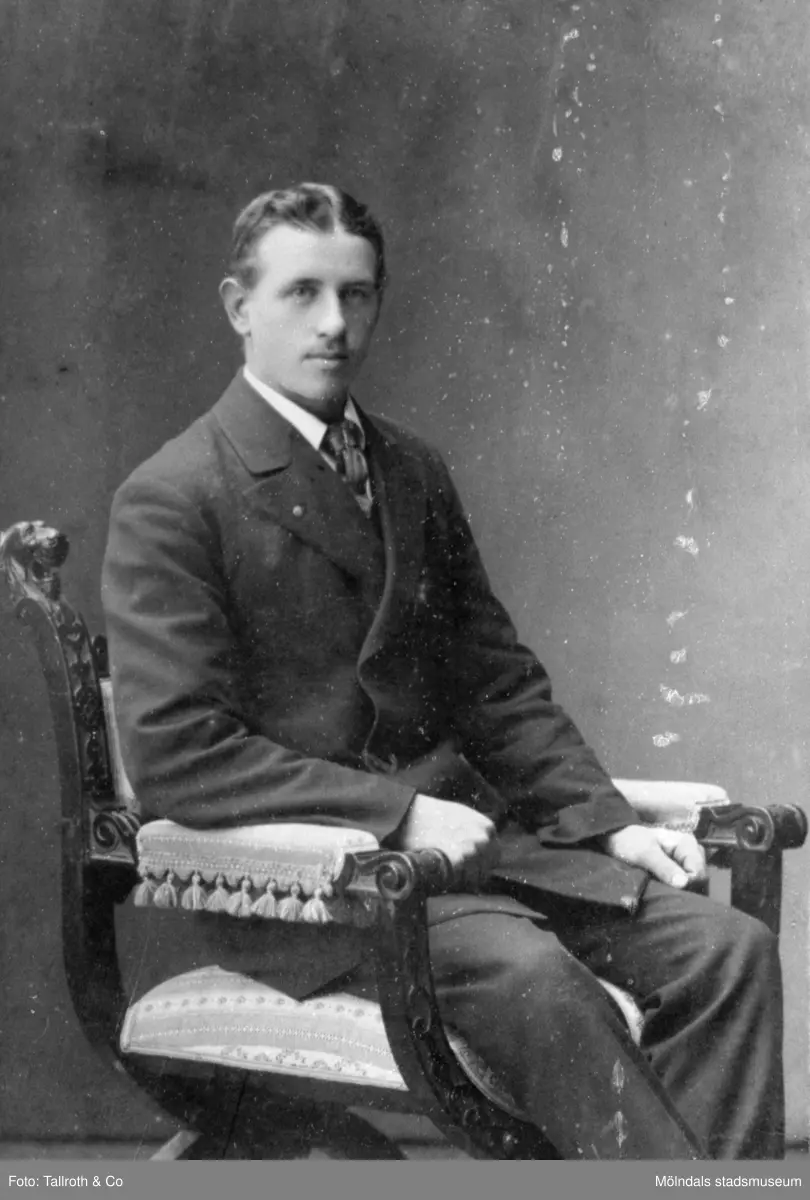 Porträttfoto av Fridolf Johansson (1890-1951) sittandes på en stol, 1910-tal. Arbetade på Gunnebo slott.