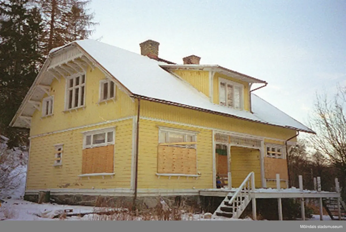 Villa Solbacken i Krokslätt, januari 1995. Ett 2-plans bostadshus med gul träpanel där vissa fönster är igenbommade. Vit altan där staketet är borttaget.