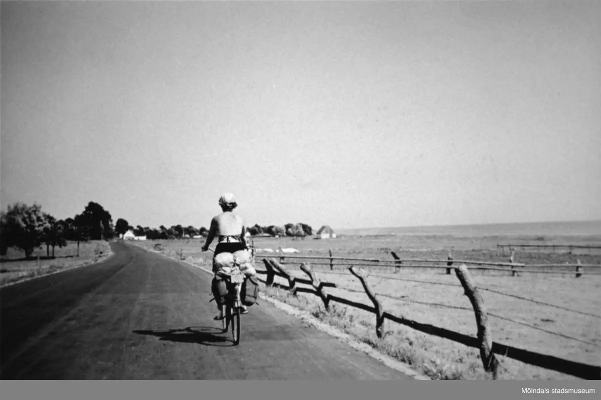 En person cyklar på en landsväg, okänd plats cirka 1930. Till höger ses en inhägnad hage.
