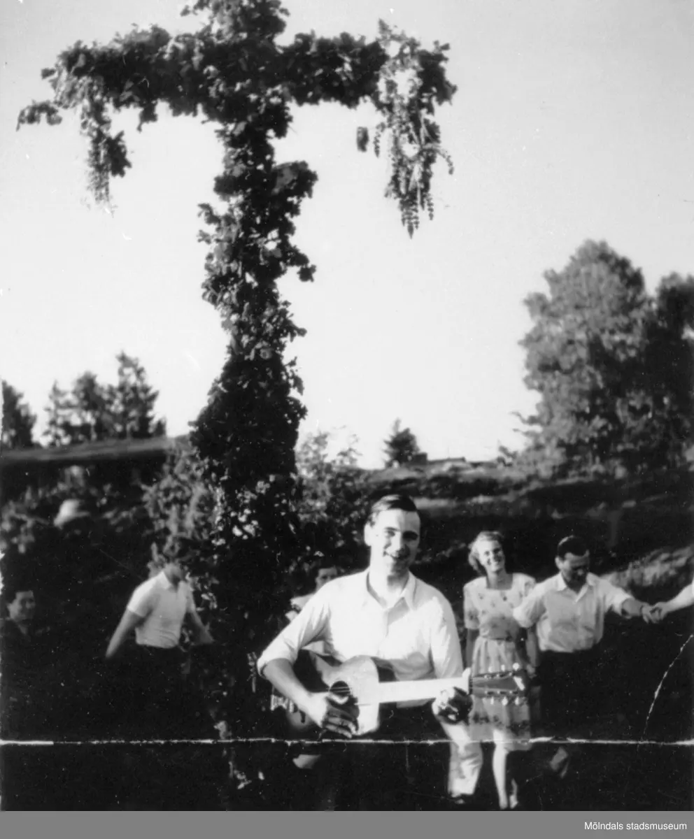 Midsommarfirande i Tulebo, Kållered. I förgrunden står Karl Erik "Räpa" Eriksson. Okänt årtal.