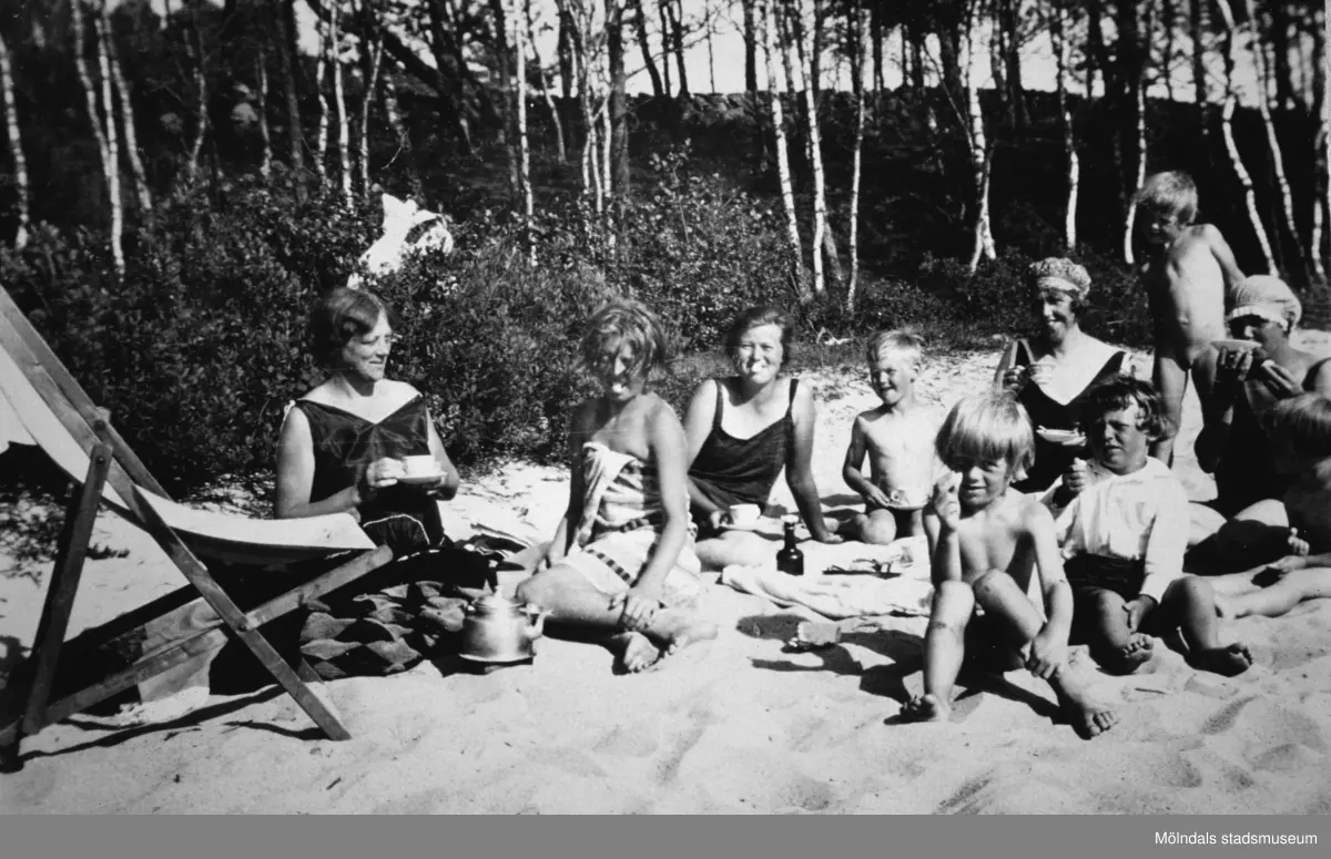 Barn och kvinnor sitter på en sandstrand, troligtvis vid Tulebosjön, 1930-tal.
