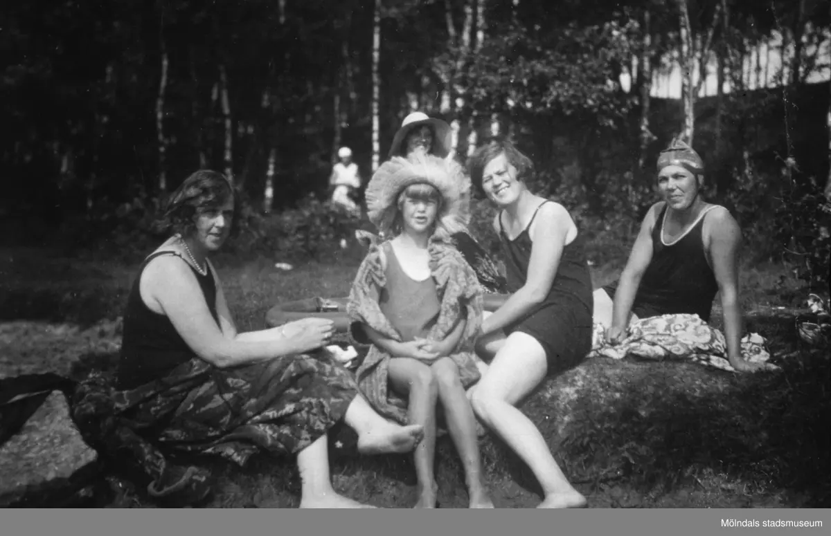 Några kvinnor och ett barn sitter på stranden vid Tulebosjön, 1930-tal.