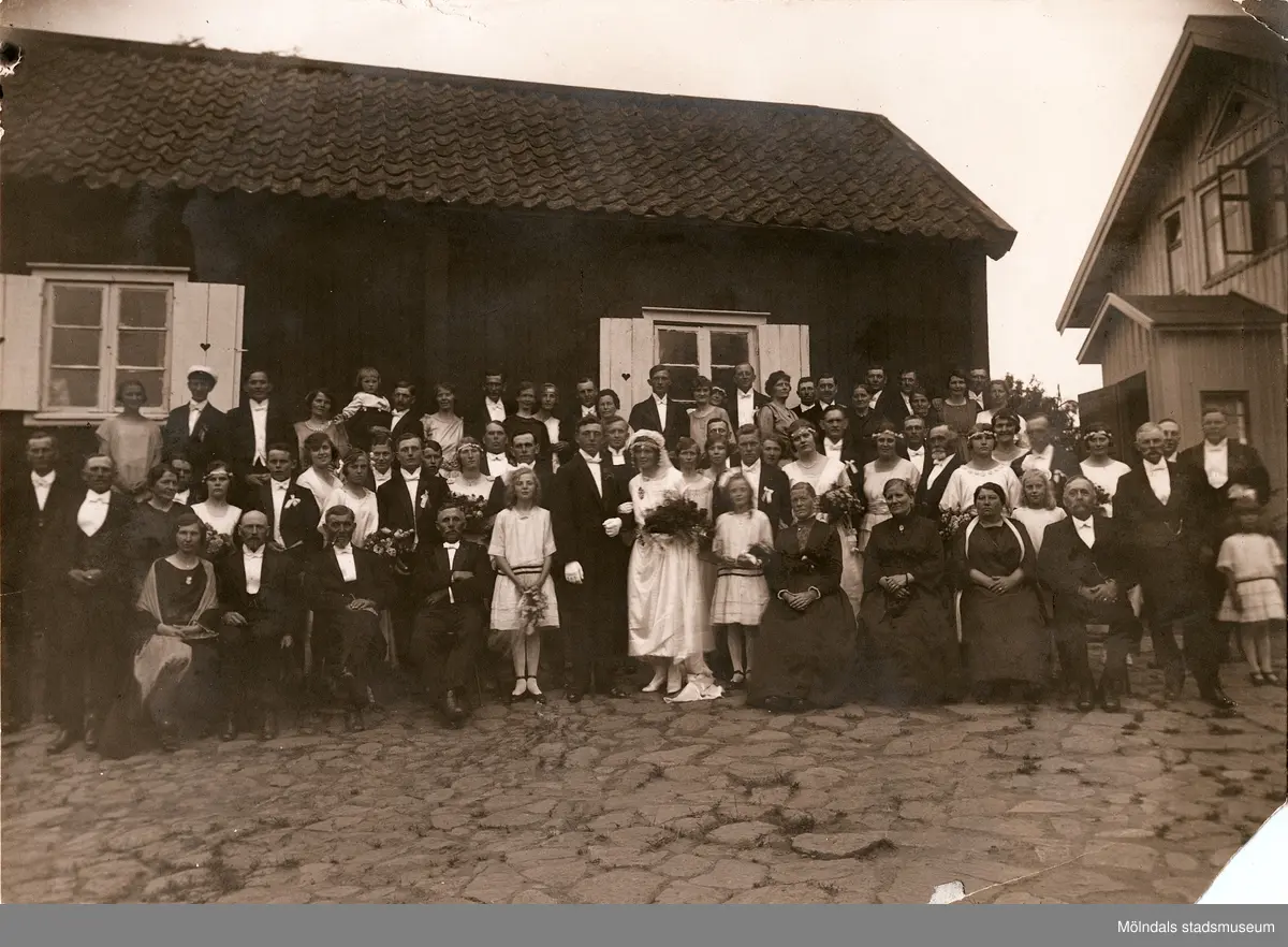 Bröllopsfotografi taget 1923. Brudparet är Edit och Ernst Andersson. De står framför husen på Fässberg Västergård 6, Fässberg 1:34, i Fässbergs by, Mölndal.