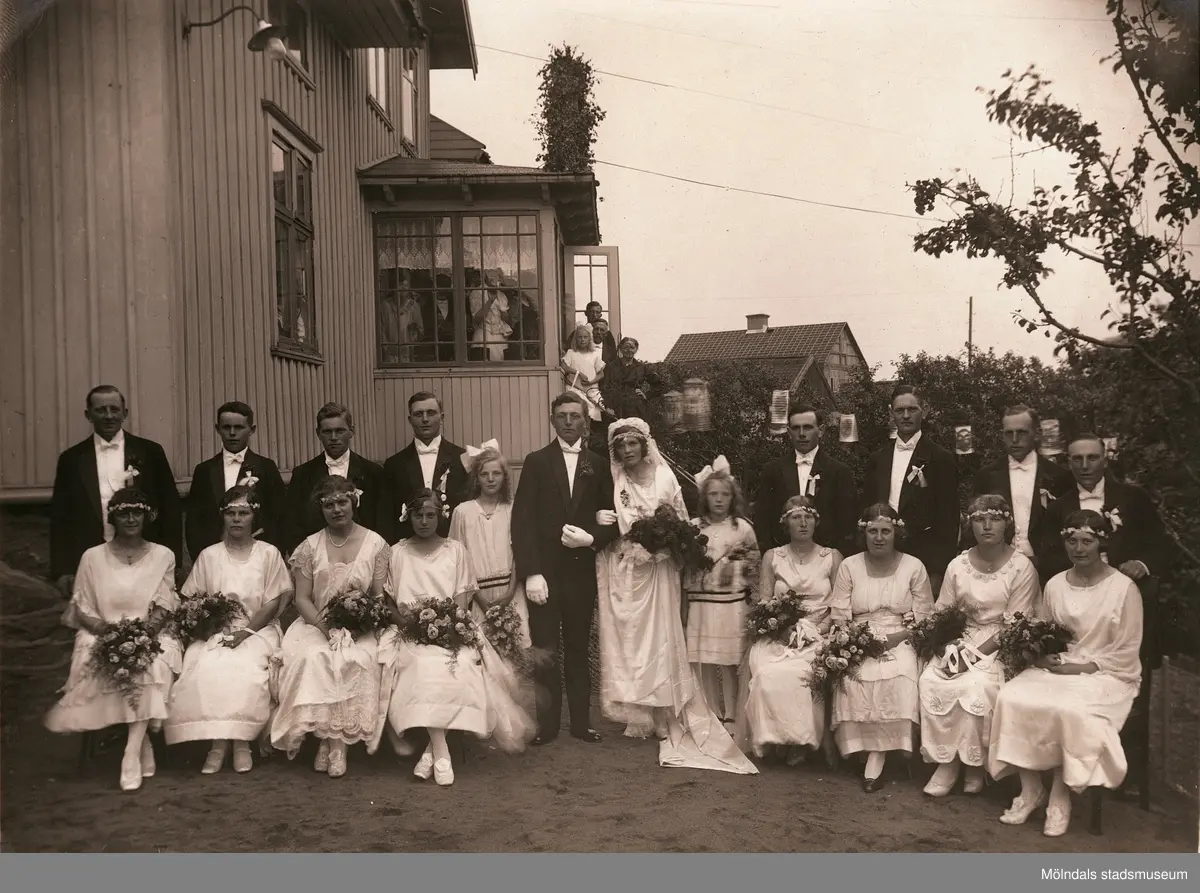 Bröllopsfotografi taget 1923. Brudparet är Edit och Ernst Andersson. De står framför huvudbyggnaden på Fässberg Västergård 6, Fässberg 1:34, i Fässbergs by, Mölndal. Huset byggdes 1903.