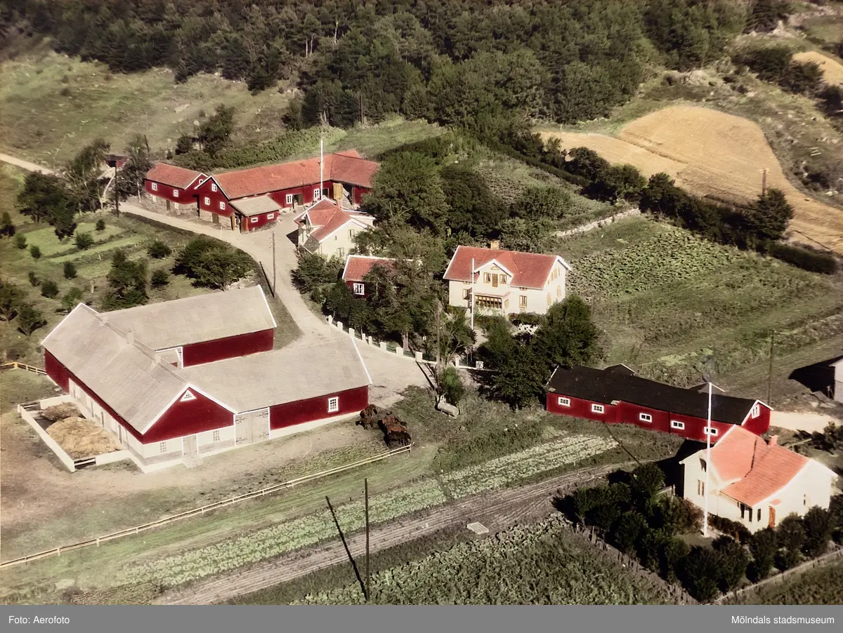 Kollorerat fotografi som visar del av Fässbergs by i Mölndal, ca 1960. Överst i bilden Fässberg 1:31, Torsgården (Fässberg Västergården 2), i mitten Fässberg 1:34, Västergården 1 och längst ner Fässberg 1:60, avstyckning från Västergården 1.