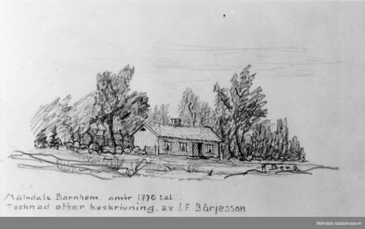Mölndals barnhem, Holtermanska, omkr. 1770-tal. Tecknad efter beskrivning av J.F. Börjesson. Direktören Martin Holterman i Ostindiska kompaniet ägde Åby gård. 1782 skänkte han 3000 daler silvermynt till Fässbergs församling + ett nybyggt skolhus och trädgård på gårdens ägor vid Åby by. I skolan skulle 10 fattiga barn undervisas i "kristendom, skrivande och något räknande. Holtermans skola fanns kvar till 1875. Då hade donationens ändamål ändrats, och man byggde i stället ett barnhem kombinerat med småskola. 1914 brann barnhemmet och 1915 byggdes ett nytt barnhem på samma tomt. 1929 överlämnades barnhemmet till Mölndals stad.