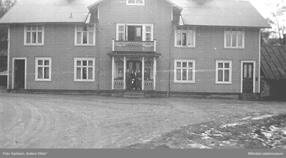 Några personer står i entrén till bostadshuset "Stallet" Kvarnfallet 31, 1930-tal. Bostadshuset tillhörde Carlsfors fabriker. Astrid Karlssons (gift Garthman) föräldrarhem.
