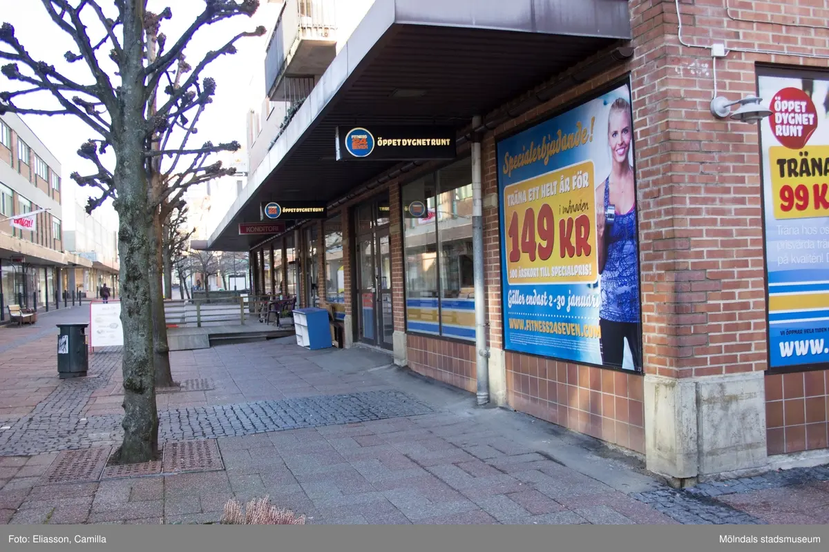 Brogatan 4-6 (fastighet Havskatten 17) strax efter Medborgaregatan, år 2015. Bild 1: Fitness24eleven. Bild 2: konditori med uteservering. Dokumentation av platsen innan rivning och nybyggnation.