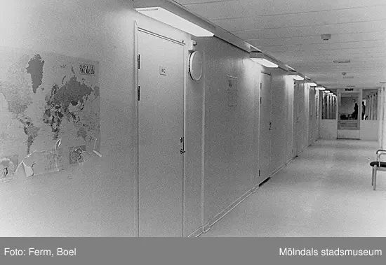 En korridor inomhus, som visar dörrar in till olika rum. Dokumentation av Sagåsens flyktingförläggning, 1992.